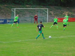 Den ersten Aufreger gab es nach 18 Minuten; unser Sechser war auf der linken Seite in die Box eingedrungen und wurde regelwidrig von den Beinen geholt – der Schiri zeigte sofort auf den Punkt. Der Gefoulte übernahm selbst Verantwortung und verwandelte sicher. Ein Dosenöffner? Leider nicht. Zwar änderte sich nichts an den Spielanteilen, viel anzufangen wussten die Schwarzgrünen mit dem Ballbesitz aber immer noch nicht; zudem hatte der Sterne-Tormann einen ganz guten Tag erwischt und bewahrte seine Farben ein ums andere Mal vor einem höheren Rückstand. So hätten die Gäste kurz vor dem Pausenpfiff das Match fast noch auf den Kopf gestellt, als sie nach Balleroberung auf der linken Seite plötzlich mit zwei Mann im Sechzehner auftauchten; Innenverteidiger und Keeper bereinigten die einzige gefährliche Situation im ersten Durchgang aber mit vereinten Kräften.
