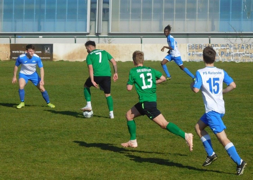 Bei schönstem Fußballwetter am Tag der Arbeit am Sonntag waren die Jungs dann zu Gast beim Nachbarn PSK auf dem neuen Kunstrasen. In der Anfangsphase hatte der SVK einige Arbeit mit dem Gastgeber und dessen intensivem Pressing. Der PSK nutzte eine Unsicherheit in der Abwehr und ging bereits nach acht Minuten in Führung. Unglücklicherweise verletzte sich der Torschütze des PSK hierbei und musste bereits früh ausgewechselt werden. Das Spiel entwickelte sich zu einem offenen Schlagabtausch in den ersten 30 Minuten zwischen zu diesem Zeitpunkt ebenbürtigen Mannschaften. Ein Doppelschlag eines Beiertheimer Außenverteidigers durch einen wunderschönen Flachschuss aus 18 Metern in die rechte untere Ecke in der 32. Minute und einem direkt verwandelten Freistoß aus 20 Metern in den rechten Winkel des Tors vier Minuten später kippte dann das Spiel zugunsten der Gäste. Die Abwehr des SVK hatte die drei schnellen und aktiven Offensivkräfte des PSK gut im Griff, und so ging es mit der knappen 2:1 Führung zum Pausentee.