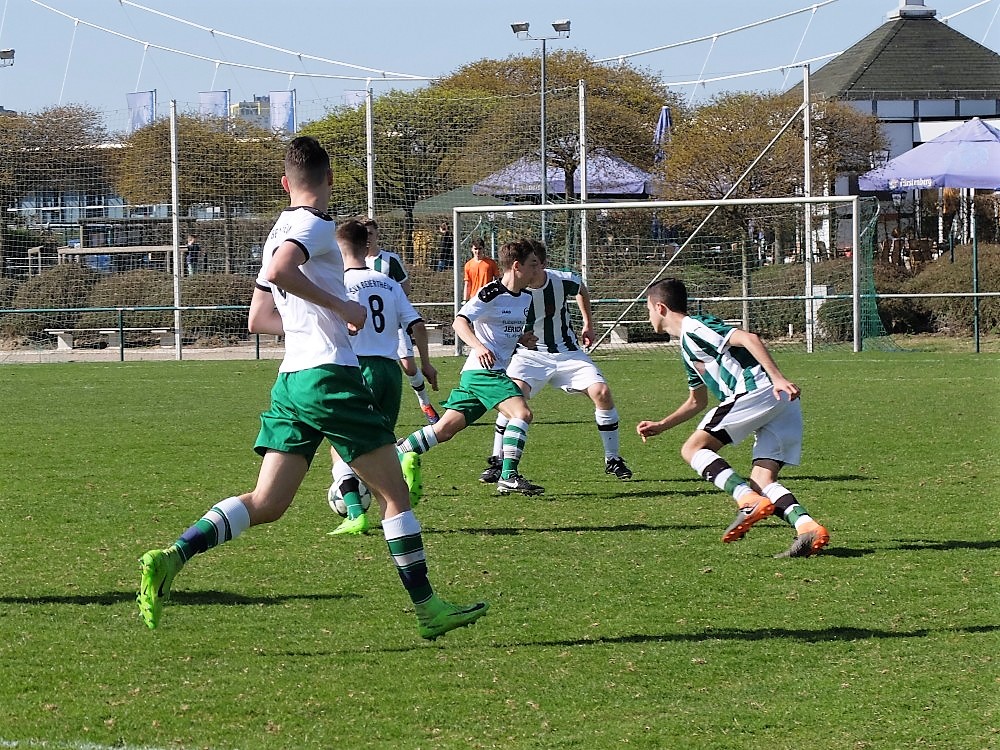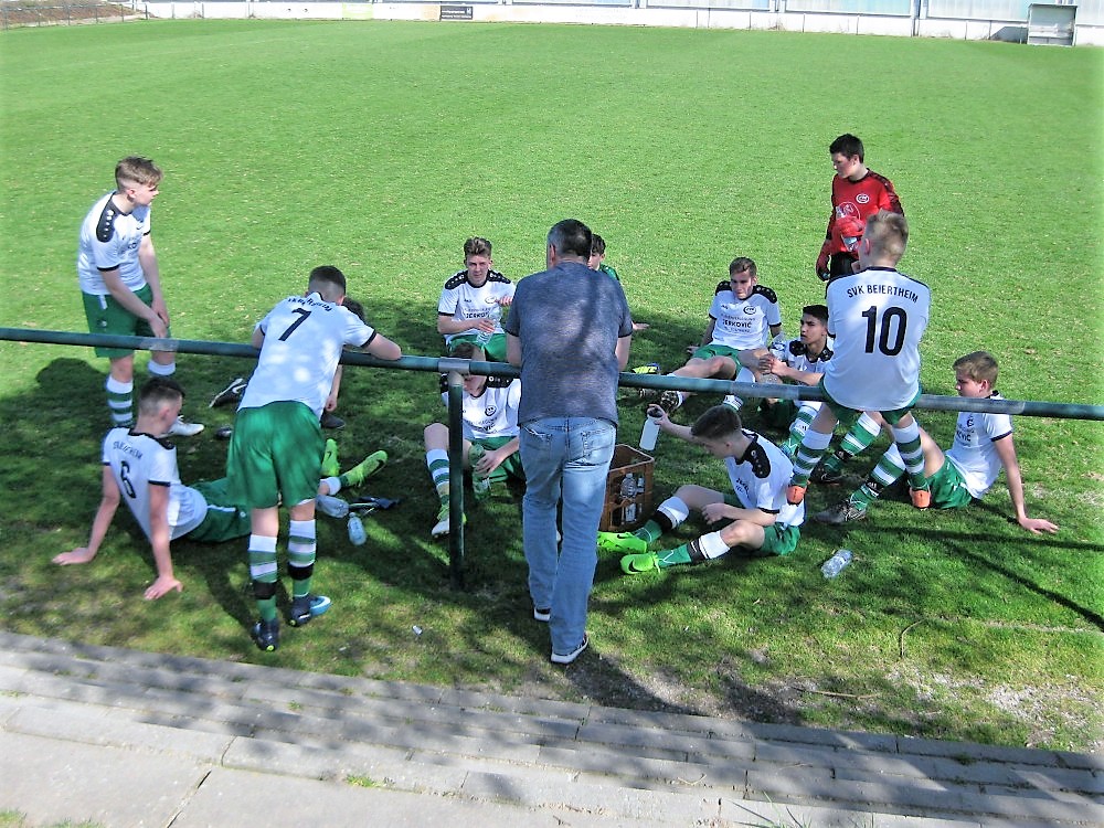 Da das Tempo recht hoch gewesen war, musste man sich angesichts der körperlichen Unterlegenheit unserer Jungs vielleicht ein bisschen sorgen. Sie spielten dann aber auch in der zweiten Hälfte mit Selbstvertrauen auf, wobei insbesondere die relativ hoch stehende Defensive tadellos agierte. Die Kirrlacher versuchten es deshalb ein ums andere Mal mit langen Bällen über die Abwehr hinweg, dem schnellen Stoßstürmer gelang es aber nicht, vor unserem Schlussmann an den Ball zu kommen. Da auch die Hausherren bei ihren Angriffsbemühungen nun meist stecken blieben – ein sehenswerter Angriff über Rechts bis zur Grundlinie blieb die Ausnahme – entwickelte sich im Mittelfeld ein immer härter werdender Kampf um kleine Räume, bei welchem beide Mannschaften die Gangart verschärften und sich auch kleinere Scharmützel mit dem Schiedsrichter lieferten, der einiges zu tun hatte, in den wirklich entscheidenden Situationen aber richtig lag. Der Spielfluss war so immer wieder unterbrochen; immerhin holten beide Teams einige Freistöße für ihre Farben heraus, wovon die Beiertheimer sicherlich den aussichtsreichsten verzeichneten; der Schuss aus gut 16 Metern fast zentral ging aber deutlich übers Tor. In der Schlussphase wurde dann wieder Fußball gespielt, und da der Unparteiische einige Minuten nachspielen ließ, versuchten sich beide Mannschaften nochmal am Lucky Punch. Am Ende konnte der SVK die beste Abwehr der Liga nicht bezwingen, der FC Olympia die zweitbeste aber auch nicht.