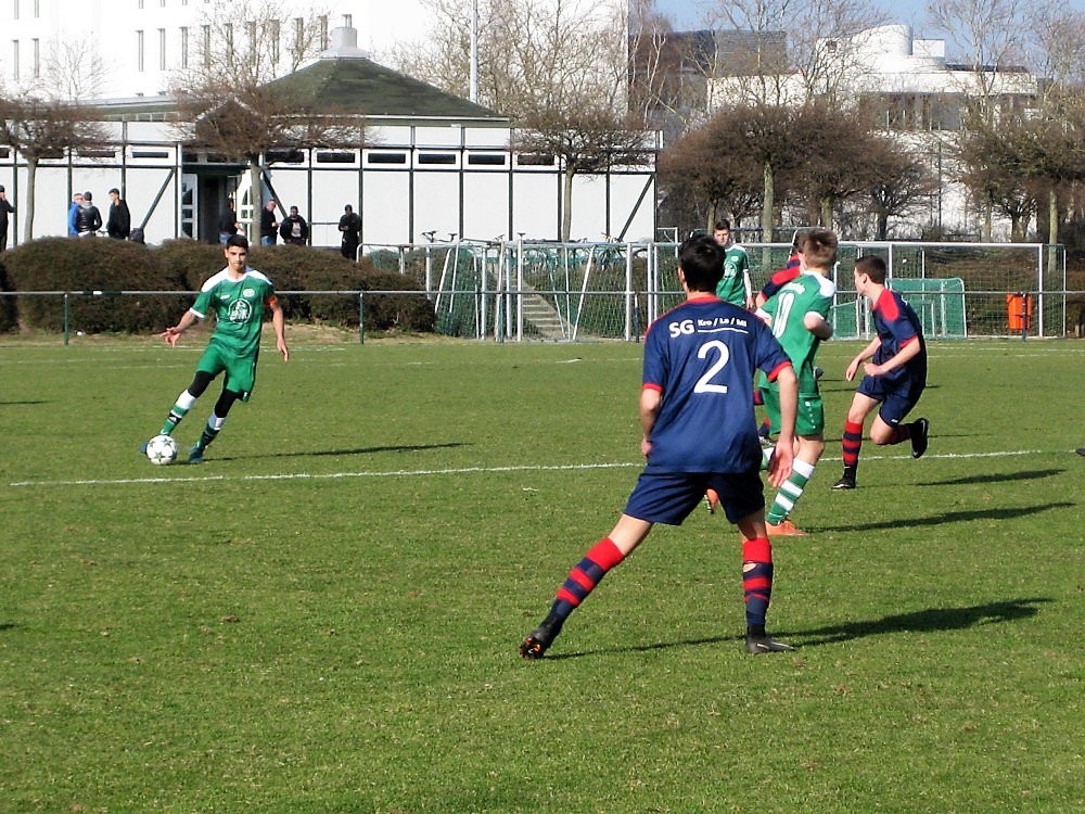 Wer nach dem Kabinengang auf höheres Nivau gehofft hatte, sah sich enttäuscht. Beiden Seiten gelang es über weite Strecken nicht, einen geordneten Spielaufbau zu organisieren. Gelegentliche Torraumszenen entsprangen eher dem Zufall. Hierbei hatten die Platzherren mehrfach Schrecksekunden nach unerklärlichen Unsicherheiten in der Defensive zu überstehen – gegen einen alles in allem kaum furchteinflößenden Kontrahenten. Dies gipfelte eine Viertelstunde vor Schluss in einem fast schon überfälligen Elfmeter für die Gäste, mehrere Male war die Pfeife des souveränen Schiedsrichters zuvor stumm geblieben, als SG-Spieler – vielleicht auch mal etwas zu theatralisch – gefallen waren. Zum Glück für die Grünen passte sich der bedauernswerte Strafstoßschütze dem Niveau des Nachmittags nahtlos an und vergab mit einem kläglichen Versuch neben den linken Pfosten. Danach hatten die Hausherren naturgemäß Oberwasser und erzielten wenige Zeigerumdrehungen später tatsächlich das entscheidende 2:0; wie der Co-Trainer sofort treffend anmerkte „eigentlich gar kein Tor“, denn der Ball fand nach beiderseitigen Unzulänglichkeiten eher notgedrungen den Weg in die Maschen. In den verbleibenden zehn Minuten drängte der SVK noch ein wenig, der Angriff blieb aber merkwürdig zahnlos.