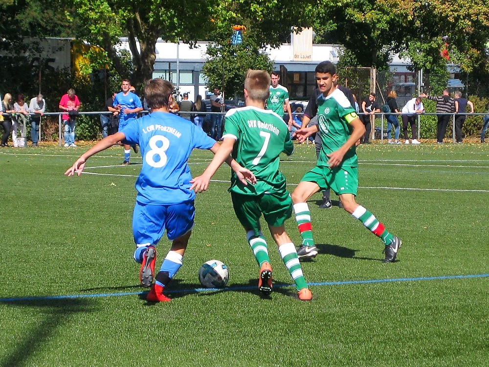 Unsere Jungs begannen also beherzt und wurden umgehend mit dem kuriosen Führungstreffer belohnt. Ein nicht richtig getroffener Ball bewegte sich eher widerwillig aufs Tor des Gegners zu, der letzte Mann beförderte ihn bei seinem missglückten Klärungsversuch weiter in Richtung Torlinie, der Keeper griff gar nicht erst ein. Der SVK hatte dann mehr vom Spiel, die Pforzheimer aber agierten giftiger und erstickten ein ums andere Mal die guten Ansätze der Gäste im Keim. Ein Spielzug bis in Strafraumnähe gelang den Hausherren erstmals in der 10. Spielminute, und dieser brachte gleich einen Elfmeter ein – ein Grüner hatte den Ball knapp hinter der Linie an die Hand bekommen. Unser Schlussmann tippte auf die falsche Ecke, und es stand 1:1. Der Ausgleichstreffer tat der Heimmannschaft sichtlich gut; die Beiertheimer zeigten zwar weiterhin die reifere Spielanlage, konnten daraus aber lange Zeit kein Kapital schlagen. Mitte der ersten Halbzeit hatten die Blauen die Chance zum Führungstreffer, der Angreifer war links durchgebrochen und wollte unseren herauseilenden Tormann mit einem Heber überlisten, dieser aber bekam den Arm noch hoch und konnte klären. Einige Minuten später brachte dann ein Freistoß für die Karlsruher aus 22, 23 Metern Entfernung erneut auf bizarre Weise die Führung: der fulminante Lattenkracher fand den Rücken des Torhüters und von dort aus doch noch in die Maschen. In der Schlussviertelstunde der ersten Halbzeit machte dann das Auswärtsteam gehörig Druck, der Lohn war das 1:3; nach schönem Angriff konnte der CfR nicht entscheidend klären, unser Sechser staubte ab.