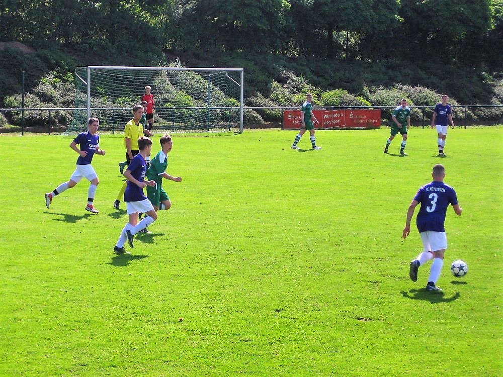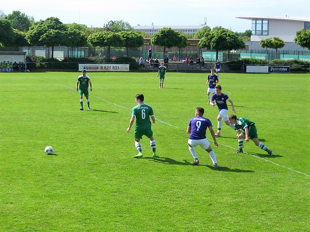 Die Beiertheimer fanden dennoch gut ins Spiel, vor allem im Mittelfeld griffen bald die eingeübten Abläufe, nach vorne hakte es aber. Die Nöttinger konnten so immer wieder Bälle erobern, in die Nähe des Sechzehners kamen sie lange aber ebenfalls nicht. So resultierte die erste Torchance aus einem Standard. Ein Eckball wurde von den Lila-Weißen mustergültig auf den langen Pfosten gezogen, die Abnahme krachte an den Pfosten, unser Keeper war wohl mit den Fingerspitzen noch entscheidend dran. Eine Situation, die man unbedingt vermeiden wollte; wenig später wurde dennoch erneut wenig souverän zur Ecke geklärt, die diesmal aber keine Gefahr brachte. In der Folge spielte sich das Match ausschließlich zwischen den Strafräumen ab, es wurde um jeden Meter gefightet, und die Atmosphäre wurde sowohl auf als auch neben dem Platz immer hitziger. Die Heimelf wirkte nach vorne einen Tick gefährlicher und generierte Mitte der ersten Hälfte zumindest zwei Halbchancen, holte sich aber in Person ihres kompromisslosen Mittelstürmers auch zu Recht einen gelben Karton ab. Kurz darauf rutschte dann ein Nöttinger mit beiden Füßen voraus in unseren Kapitän, der Schiedsrichter zeigte sofort glatt Rot; eine sehr harte Entscheidung, zumal sich der Spieler bis dahin nichts hatte zu Schulden kommen lassen. Die Diskussionen danach brachten nichts ein, jedoch landete unser Coach schließlich auf der Tribüne. Wenige Minuten vor dem Pausenpfiff dann die schönste und entscheidende Szene der Begegnung: nach einer technisch anspruchsvollen Ballstafette mit zwei Doppelpässen in der Hälfte des Gegners wurde unserem lauernden Mittelstürmer scharf in den Lauf gespielt, dieser ging noch einige Meter und vollendete eiskalt zum Tor des Tages.