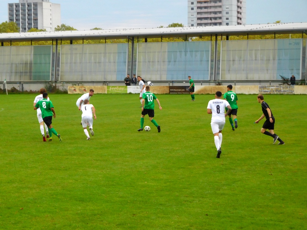 Entsprechend engagiert gingen die Hausherren zu Werke und ließen den Gästen vom Anpfiff an nur sehr wenig Raum. Das Mittelfeld wurde mit technisch und läuferisch überlegenem Spiel gut beherrscht, bis zur Strafraumgrenze wurde den Zuschauern sehr ansehnlicher Fußball geboten. Auch an ihrer Einstellung ließen die Grünschwarzen nicht den geringsten Zweifel aufkommen, je eine gelbe Karte für körperliches sowie verbales Fehlverhalten in der Anfangsphase zeugten davon. Allzu schwer machte man dem in Halbzeit eins sehr defensiv eingestellten SC die Verteidigungsarbeit aber nicht – der vorletzte Pass gelang selten, und trotz mehrfacher „Vollversammlung“ am Sechzehner der Weißen wagten die Beiertheimer keine Abschlüsse, schienen den Ball ins Tor tragen zu wollen.