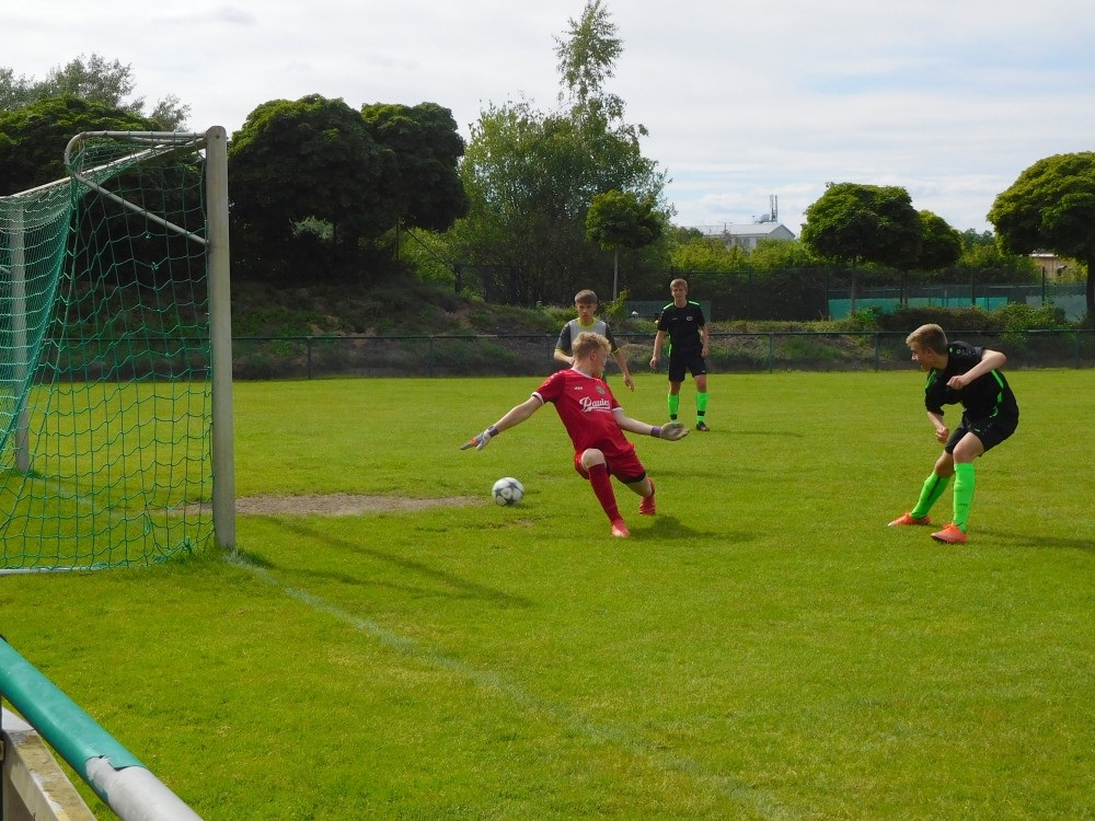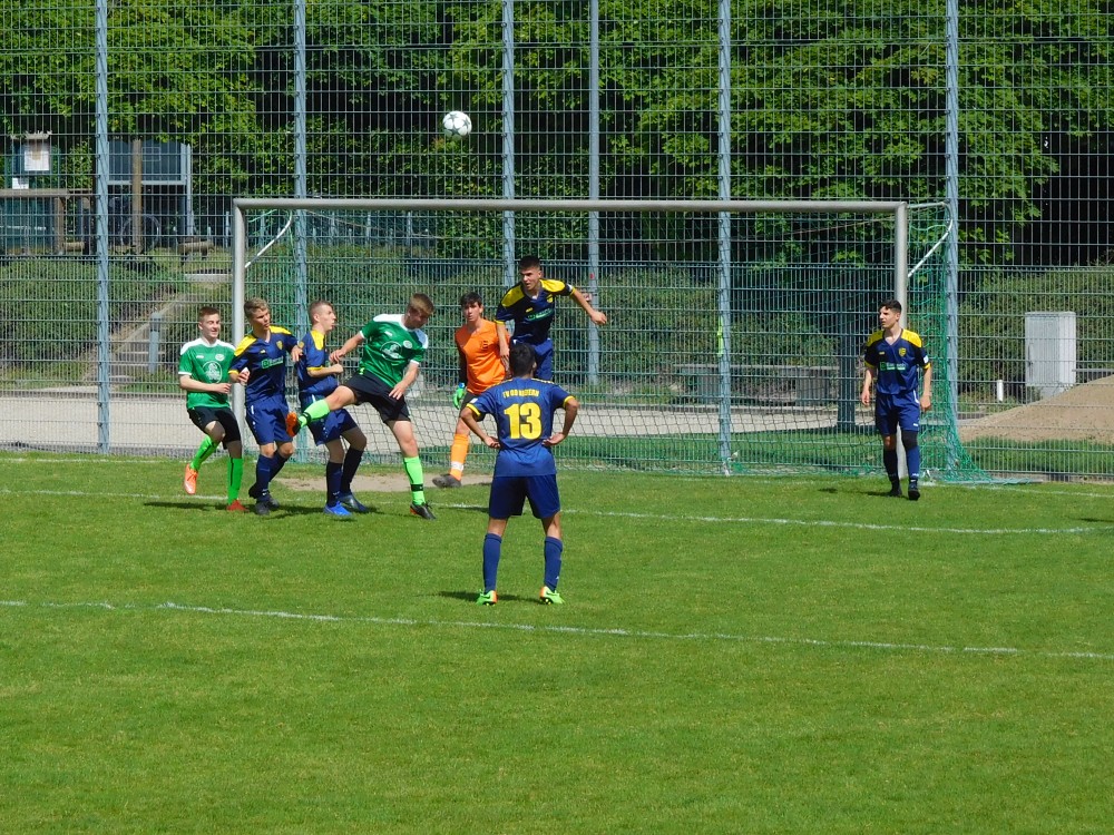 Zwei Tage nach dem 10:1 gegen Malsch bestritt unsere B1 ihr letztes Saisonspiel in der Landesliga Mittelbaden. Am Europabad empfing man den Tabellenfünften FV 09 Niefern, mit dem man sich im Hinspiel einen harten Fight geliefert hatte. Sportlich hatte die Partie für beide Teams keine Bedeutung mehr, die Beiertheimer legten aber los, als ginge es um ihre Existenz. In den ersten sechs Minuten kam der FV nicht aus seiner Hälfte und lag dann schon zurück – unser Mittelstürmer war mal wieder in seiner unnachahmlichen Art erfolgreich gewesen. Die Gäste wechselten früh doppelt und stellten um, besser wurde es dennoch nicht; nach zwanzig Minuten legte unser Zehner zum 2:0 nach. Trotz aufkommender Hitze und nach einigen kurzfristigen Absagen mit nur einem Mann auf der Wechselbank verschärften die Grünen dann nochmals das Tempo, die 09er wussten wohl kaum, wie ihnen geschah. Nach 25 Minuten traf unser rechter Offensivmann nach fintenreichem Slalom, nach 26 Minuten erneut der Goalgetter nach vorausgegangenem „Dauerbeschuss“ und nach 33 Minuten unser schneller rechter Außen mit einem Wahnsinnsheber nach Alleingang fast von der Mittellinie aus. Einen Ball aufs Tor brachten die Blaugelben schließlich auch, unser Schlussmann stand nicht optimal, fischte ihn aber weg. Dann endete eine begeisternde erste Halbzeit, die Heimfans rieben sich die Augen.