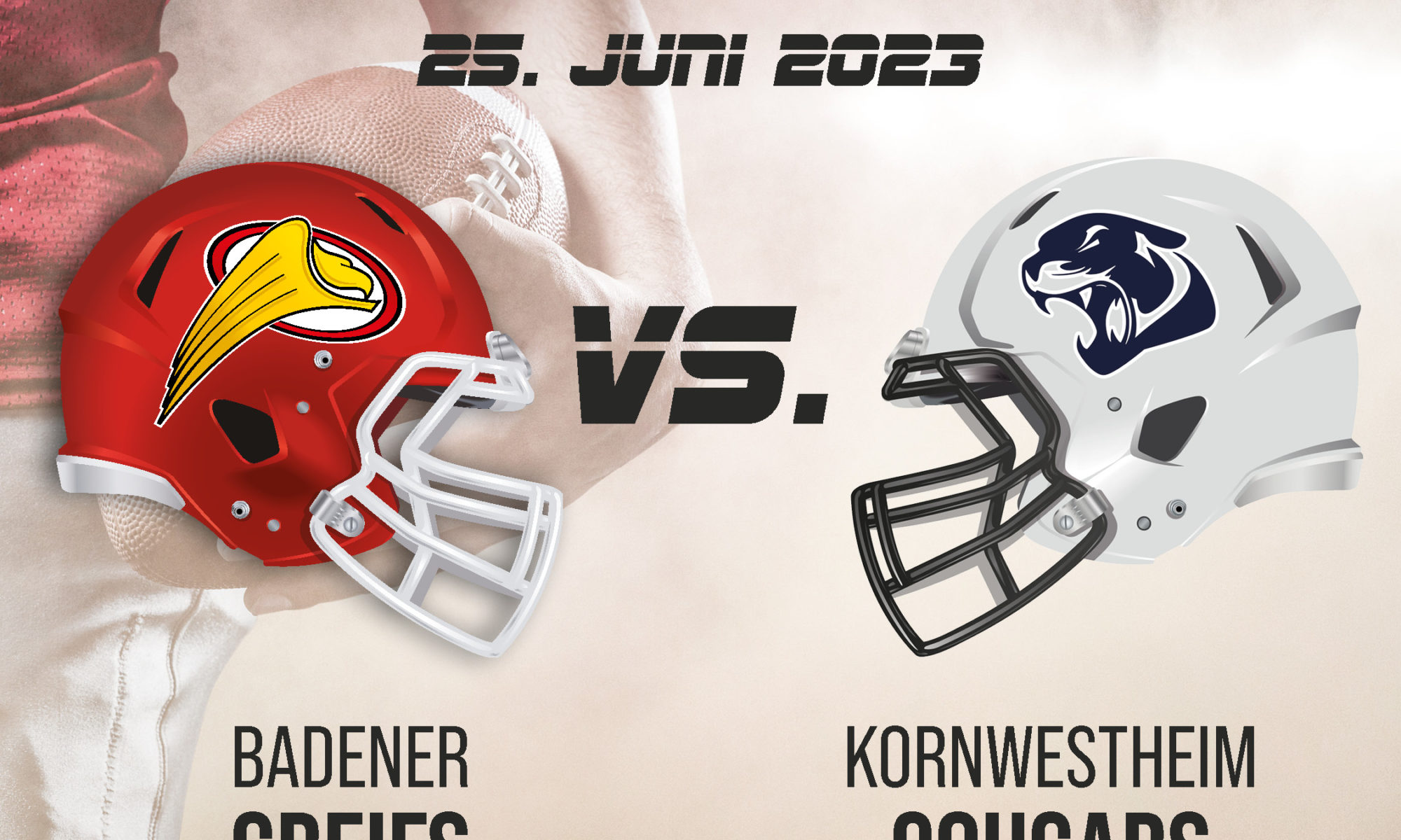 Badener Greifs vs. Kornwestheim Cougars Termin Details Datum: 25. Juni 2023 15:00 – 18:00 Ort: Carl-Kaufmann-Stadion Terminkategorien: Badener Greifs
