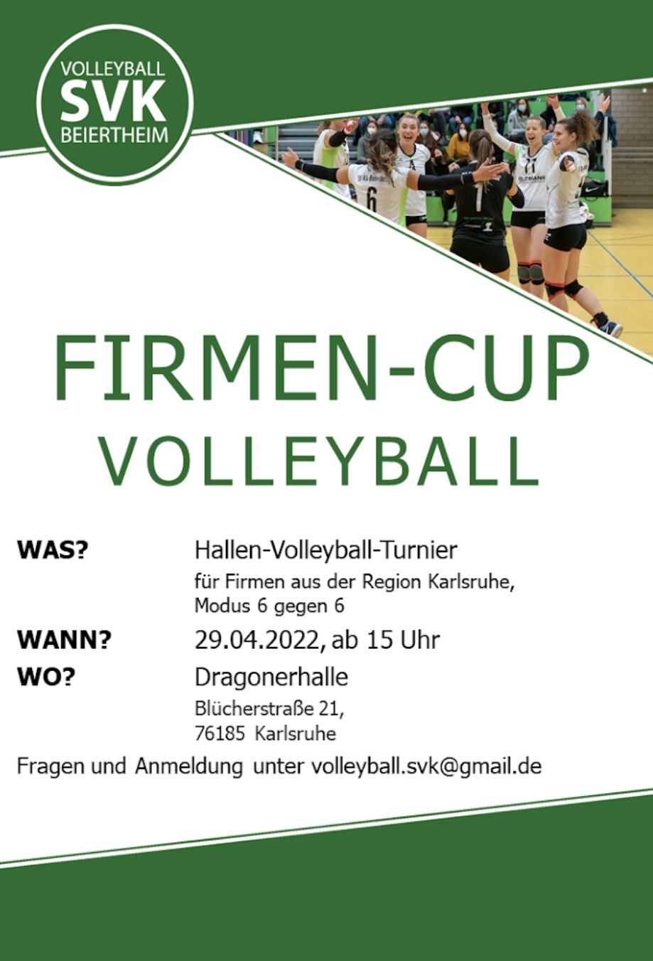 wir vom SVK- Beiertheim wollen Sie zu unserem ersten Hallenvolleyball-Firmencup einladen. Sie haben die Möglichkeit, ein oder mehrere Teams -aus Ihren Mitarbeitern bestehend- anzumelden. Außerdem haben Sie die Chance, sich mit anderen Firmen zu messen und den Tag zum Austausch zu nutzen. Die Halle bietet auch Platz für Zuschauer, daher sind Familien und Freunde auch herzlich eingeladen.