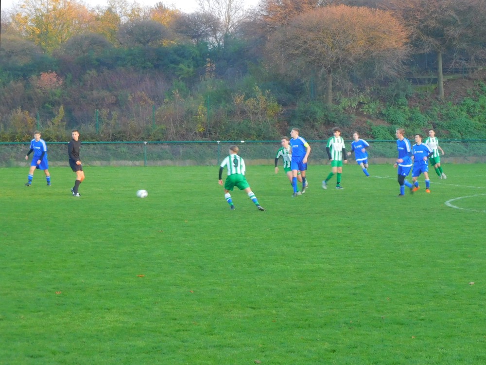 Unser Cheftrainer hatte indes allerhand damit zu tun, immer elf einsatzfähige Spieler auf dem Rasen zu haben, und bewies dabei gut zwanzig Minuten vor Schluss ein glückliches Händchen. Der Mitte der ersten Hälfte schon ausgepumpte rechte Stürmer durfte noch mal rein, marschierte kurz darauf außen lang, flankte in die Mitte und erreichte unseren abgezockten Mittelstürmer, der nach einem unnachahmlichen Tänzchen seinen Doppelpack schnürte. Die Grünweißen waren danach überlegen und hatten mehrere Gelegenheiten, den Sack endgültig zuzumachen, schafften dies aber nicht einmal, als sie in der 75. Minute zu zweit vor dem leeren Tor standen. Stattdessen fing man sich einen Konter ein, unser rechter Innenverteidiger behielt jedoch die Nerven und klärte mit seiner besten Aktion des Spiels stark. Danach durfte auch unser Schlussmann noch einmal sein Können zeigen, ehe der SVK in der Schlussphase aufs dritte Tor drängte; dem Pfinztaler Abwehrchef, der sich hierbei hoffentlich nicht ernsthaft verletzte, wünschen alle Beiertheimer an dieser Stelle gute Besserung! Letztlich sollte kein Tor mehr fallen – der junge Unparteiische, der mit der Partie keine Schwierigkeiten hatte, beendete die für unsere neugegründete A2 überaus erfolgreiche erste Halbsaison.