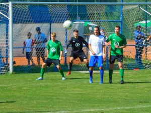 Nur eine Zeigerumdrehung später schaltete der TV nach viel zu leichtem Ballgewinn schnell um und erzielte prompt den Ehrentreffer. Danach luden die Karlsruher die Blau-Weißen mit einigen haarsträubenden Fehlpässen nachdrücklich zu mehr ein, die Gastgeber wussten jedoch aus den unverhofften Gelegenheiten kein Kapital zu schlagen. So verflachte die Partie in der Schlussphase etwas, wobei man natürlich die noch immer fast 30° entschuldigend erwähnen muss – der eine oder andere Gästeakteur musste sich angesichts der leeren Wechselbank über die Zeit quälen. Den Schlusspunkt setzte man dennoch – einen schönen Angriff über links nutzte der linke Offensivmann in der letzten Spielminute zum letztlich doch deutlichen 1:5-Endstand. Unmittelbar danach beendete der fehlerfreie Schiri die jederzeit faire Partie.