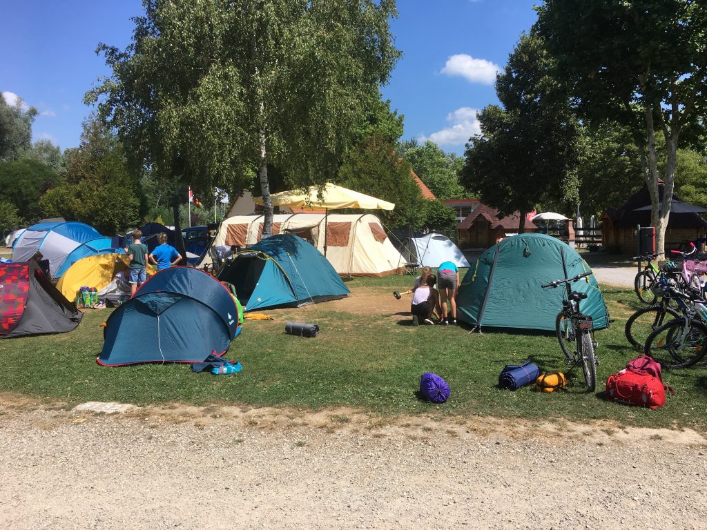 Wir trafen uns mit unseren Fahrrädern am Karl-Kaufmann-Stadion und starteten los über die Fähre in Neuburgweier nach Lauterbourg. Nachdem wir am Campingplatz angekommen waren, bauten wir unsere Zelte auf, und gingen unser Mittagessen in Lauterbourg einkaufen. Nach dem Essen war erstmal eine Abkühlung im überwachten Badesee angesagt.