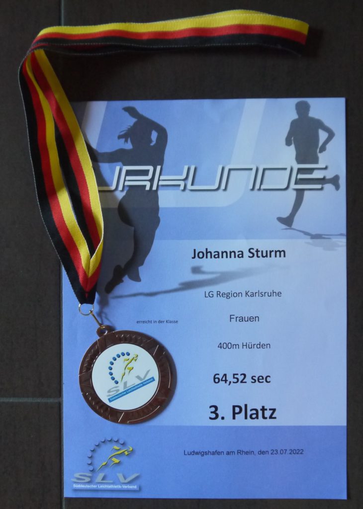 Bereits am Wochenende darauf startete ich sonntags (24.07.2022) in Ludwigshafen bei den Süddeutschen Meisterschaften. Hier konnte ich meine Bestzeit über 400m Hürden auf 64,52 Sekunden steigern und mir damit den dritten Platz sichern.