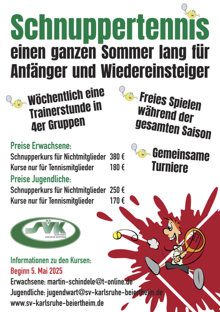Auch im Sommer 2025 bieten wir unsere beliebten Tenniskurse für Anfänger und Wiedereinsteiger an. Wir müssen allerdings die Trainingskapazitäten wegen der hohen Platzbelegung einschränken. Es empfiehlt sich eine frühzeitige Anmeldung.