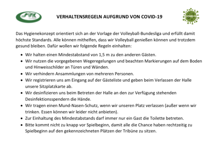 Das Hygienekonzept orientiert sich an der Vorlage der Volleyball-Bundesliga und erfüllt damit höchste Standards. Alle können mithelfen, dass wir Volleyball genießen können und trotzdem gesund bleiben. Dafür wollen wir folgende Regeln einhalten: